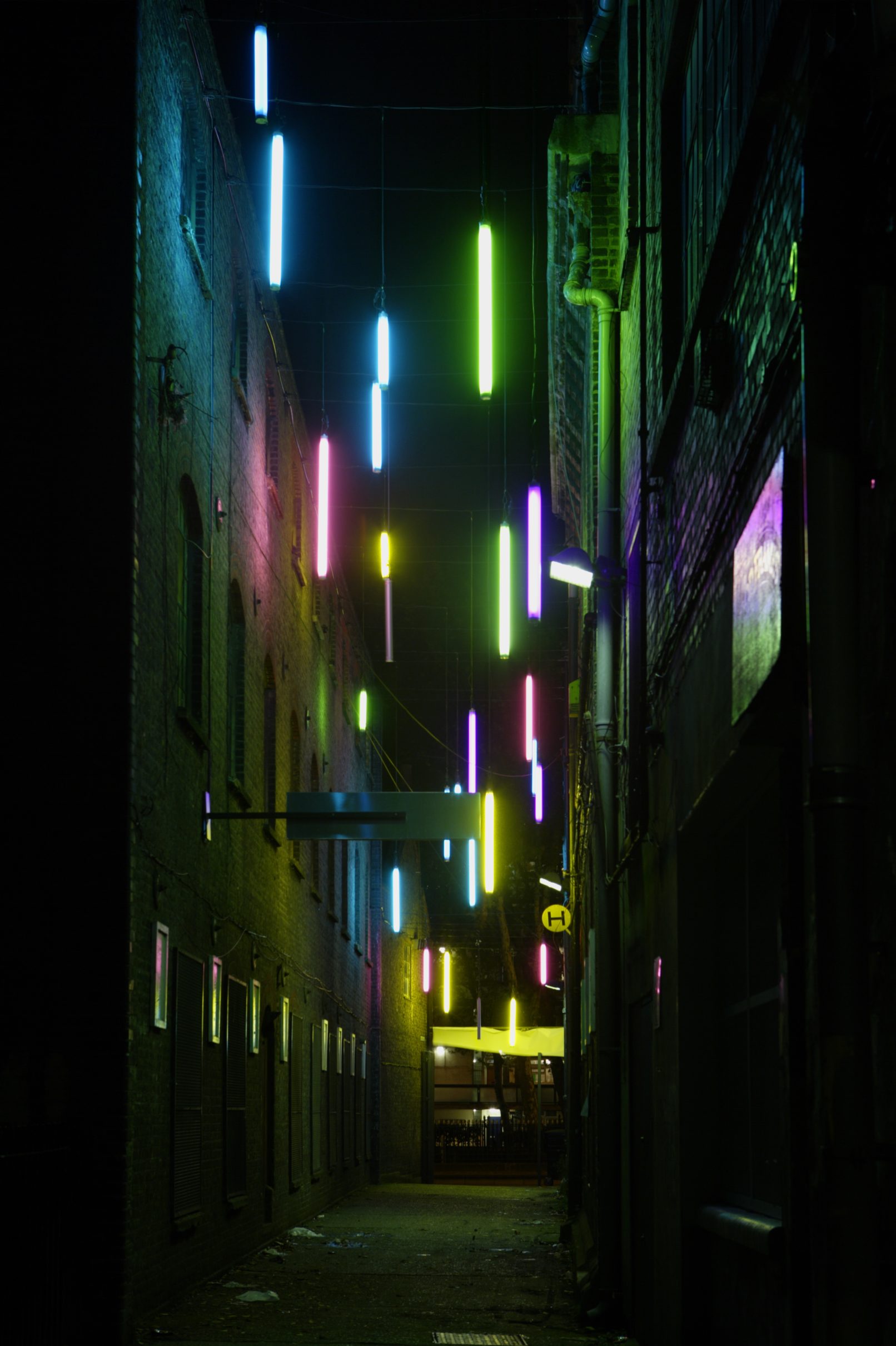 The installation consists of a network of coloured fluorescent tubes of different lengths, distributed at different heights along the entire length of the alley. It responds emphatically to its context, lending lightness to a once oppressive cul-de-sac and bathing the high, dark walls in vibrant colour. Dangling from a net of high-tensile wires, the lights move in the wind, creating movement and constant animation in the space.