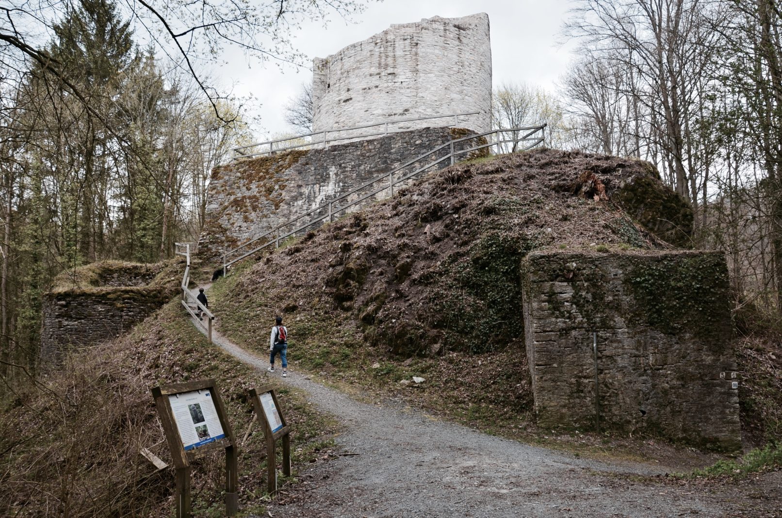 Gestaltung des Zugangs und der Aussichtsplattform für diesen historischen Turm im Naturpark Frankenwald, Oberfranken. Die Burgruine Nordeck aus dem Jahr 1100 ist eine hochmittelalterliche Burgruine in einer Spornlage nordöstlich von Stadtsteinach im oberfränkischen Landkreis Kulmbach in Bayern.